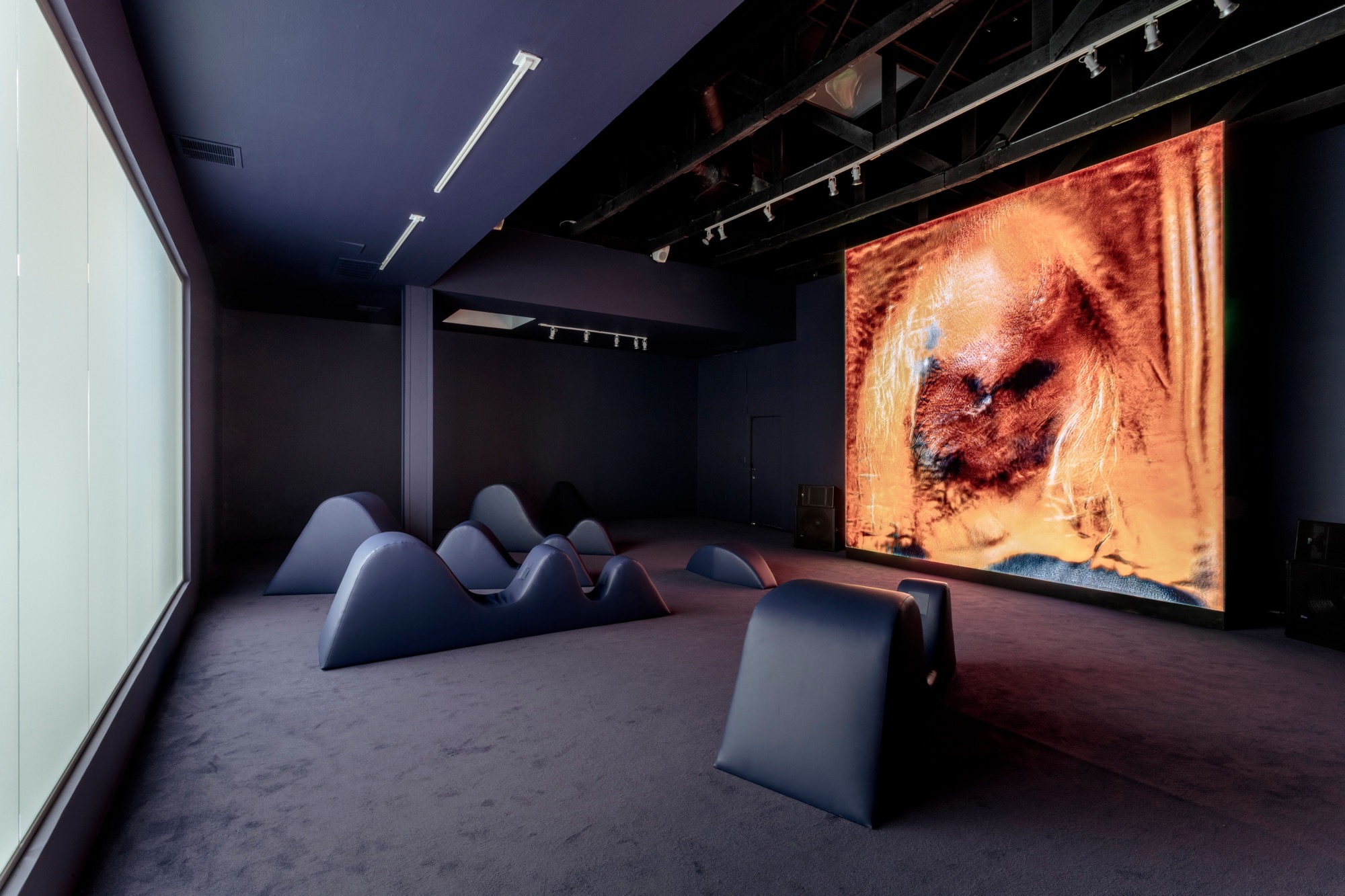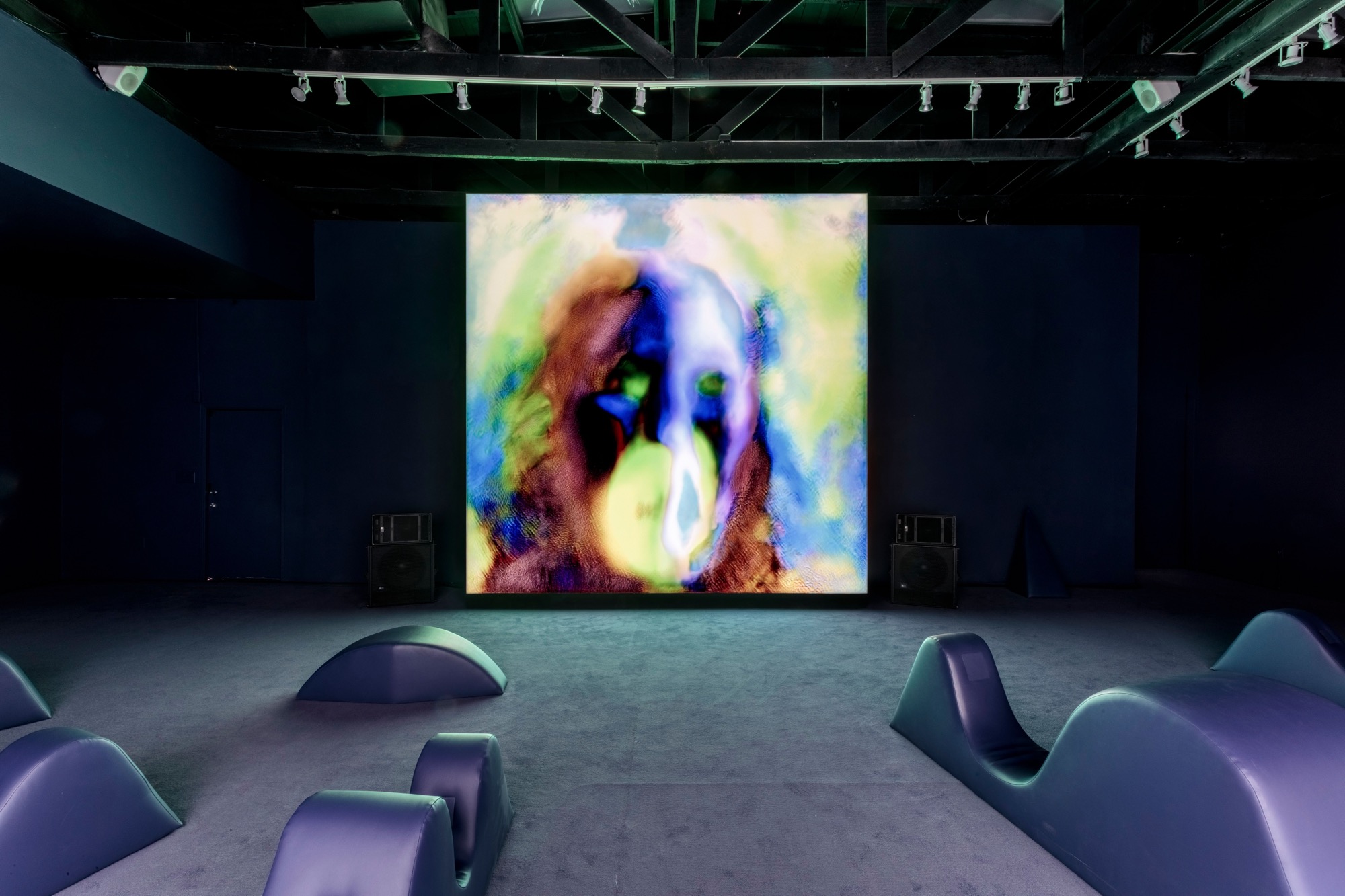 In Marco Perego's The Being, a neural network trained to generate speculative faces is pushed far beyond its limits, endlessly attempting to create a coherent human face on a large LED wall. The system is never quite allowed to succeed, producing instead a continuous hallucinatory stream of near-faces. Custom furniture in the space quietly measures visitors' breath and heart rates, feeding their presence back into the output.